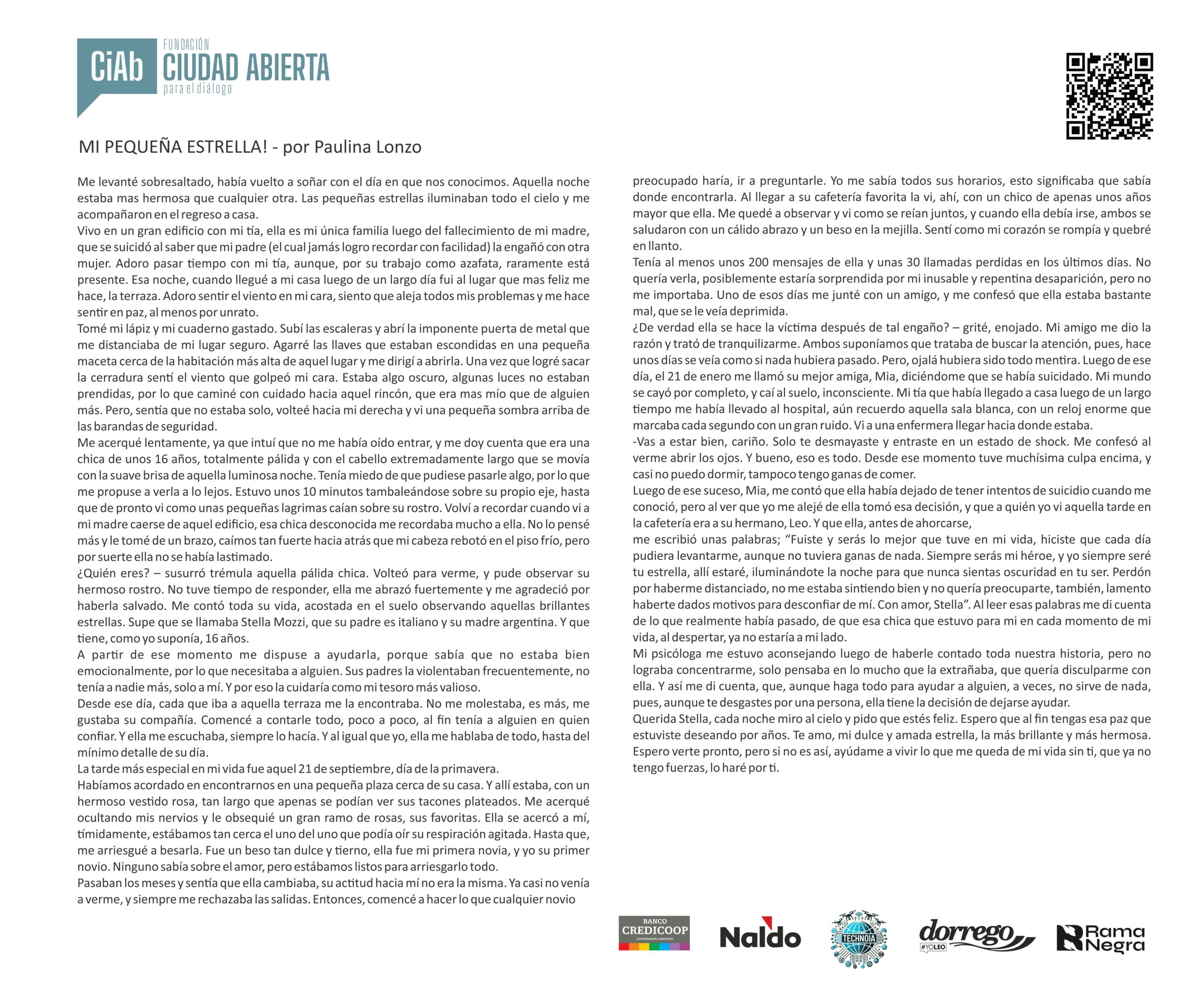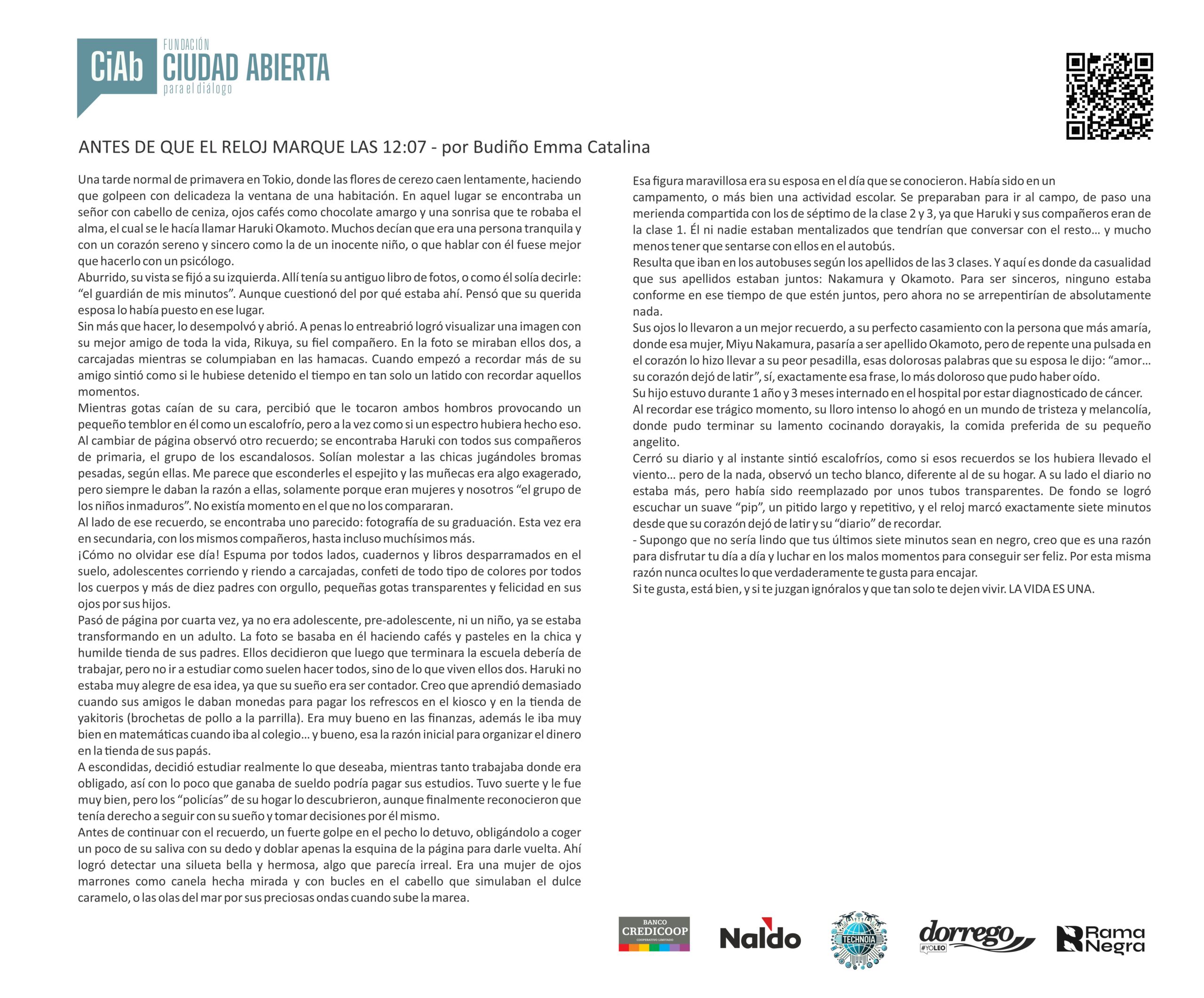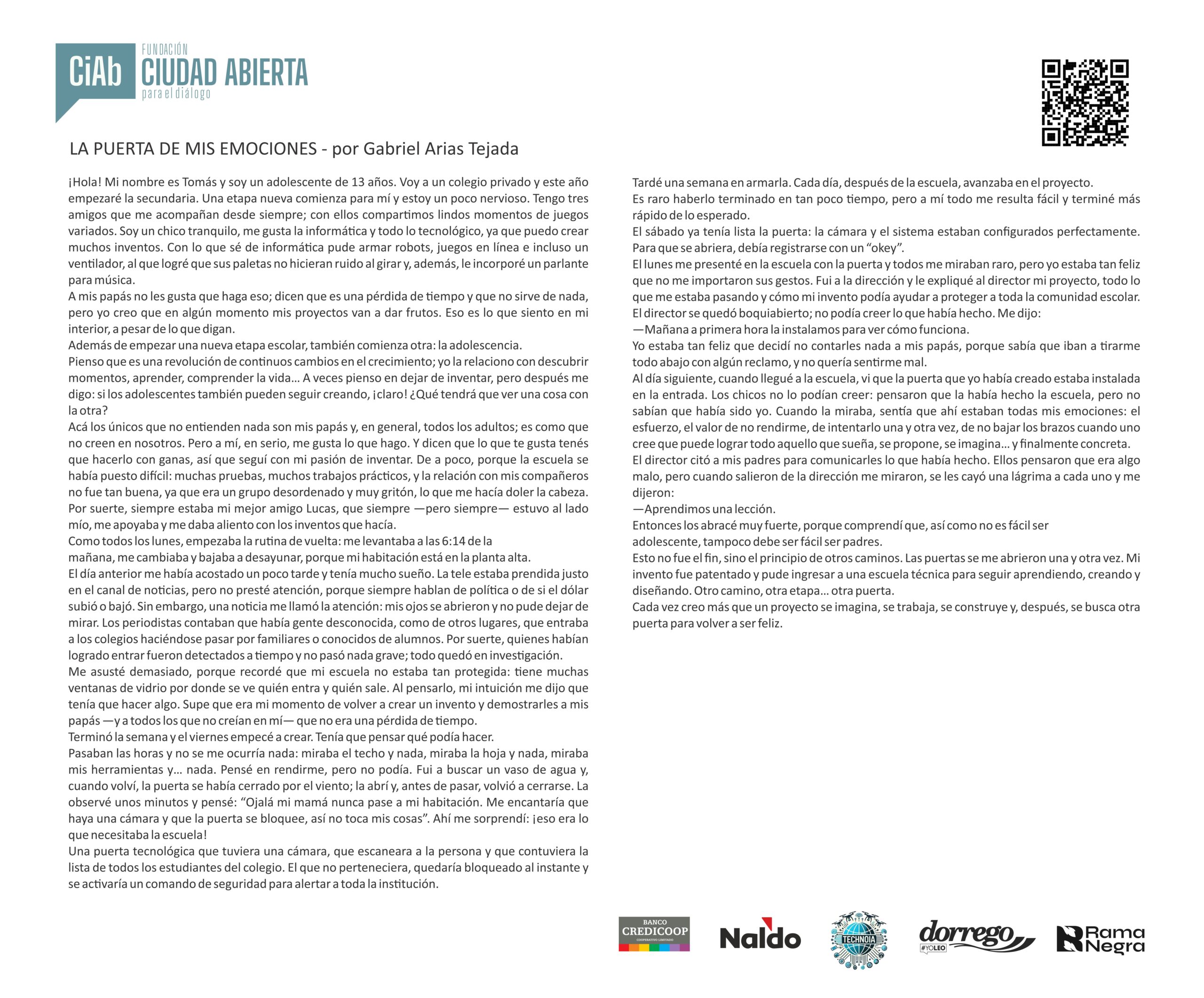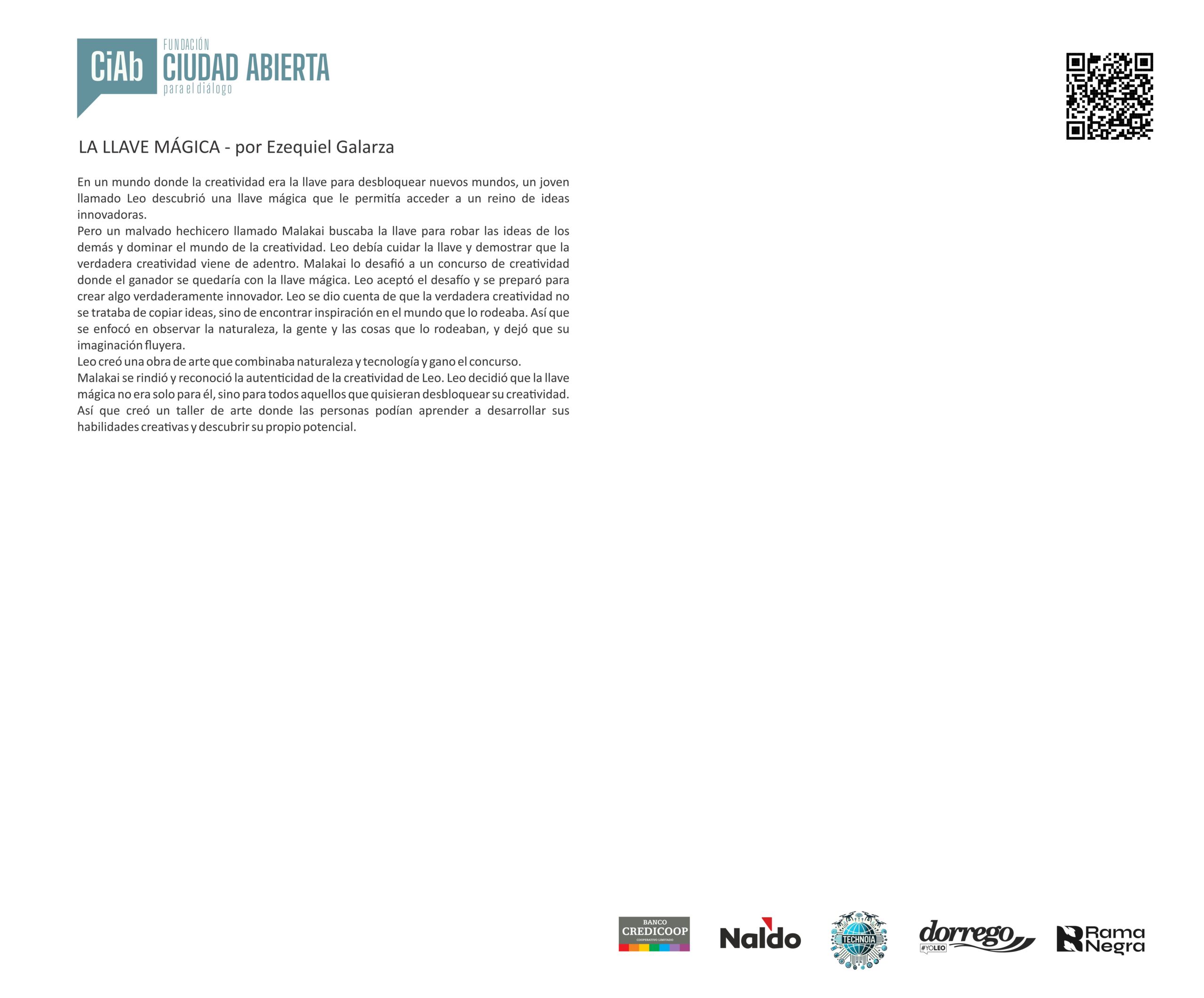 Mensaje del jurado Juan José Becerra: “Para mí fue un verdadero honor participar como jurado del concurso de la Fundación Ciudad Abierta. Puede sonar como una formalidad, como algo que uno dice porque queda bien, pero en este caso no es así: realmente lo siento. Y lo siento incluso más profundamente que en otras ocasiones en las que integré jurados, porque nunca antes me había tocado leer textos escritos por chicos tan jóvenes.