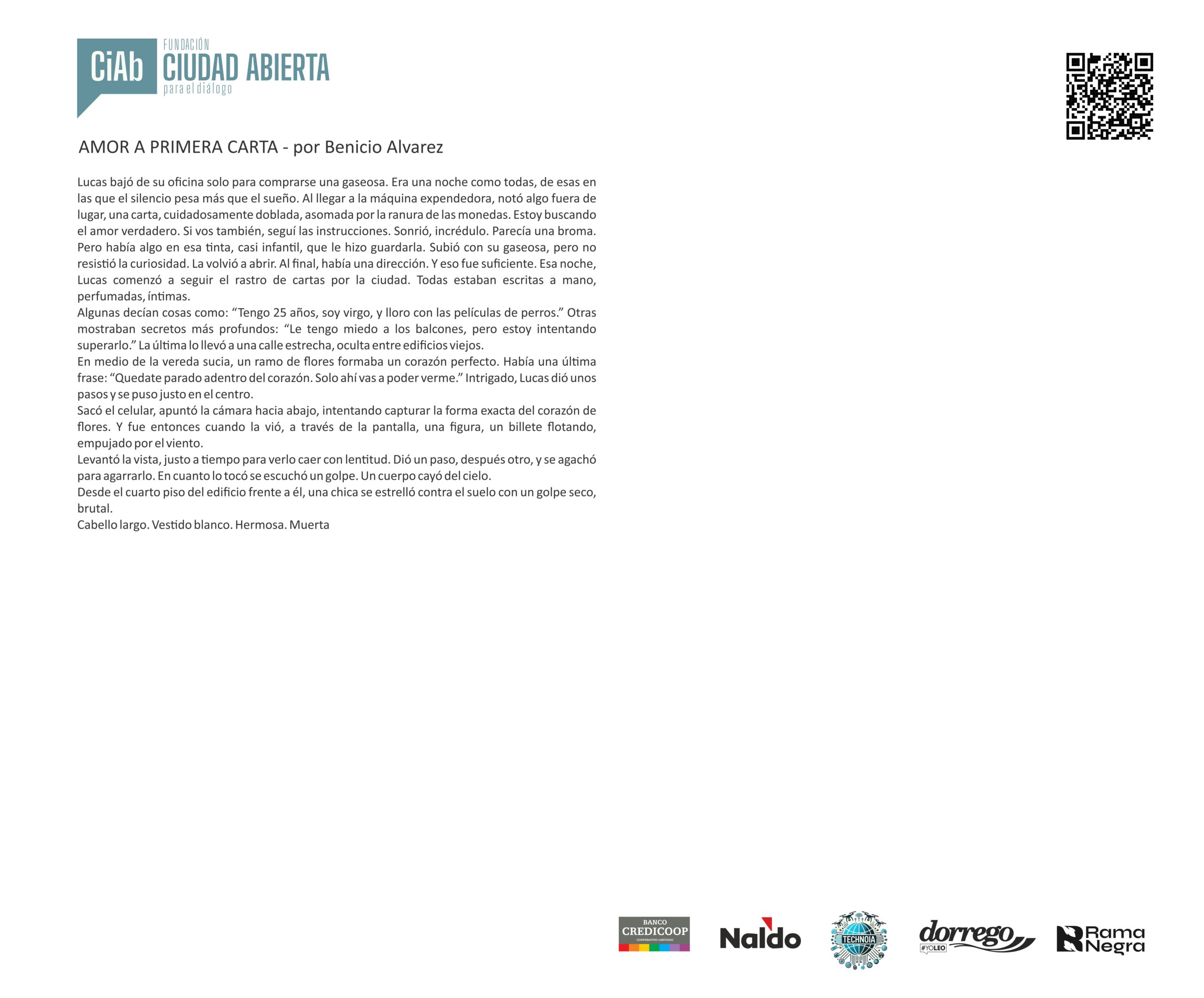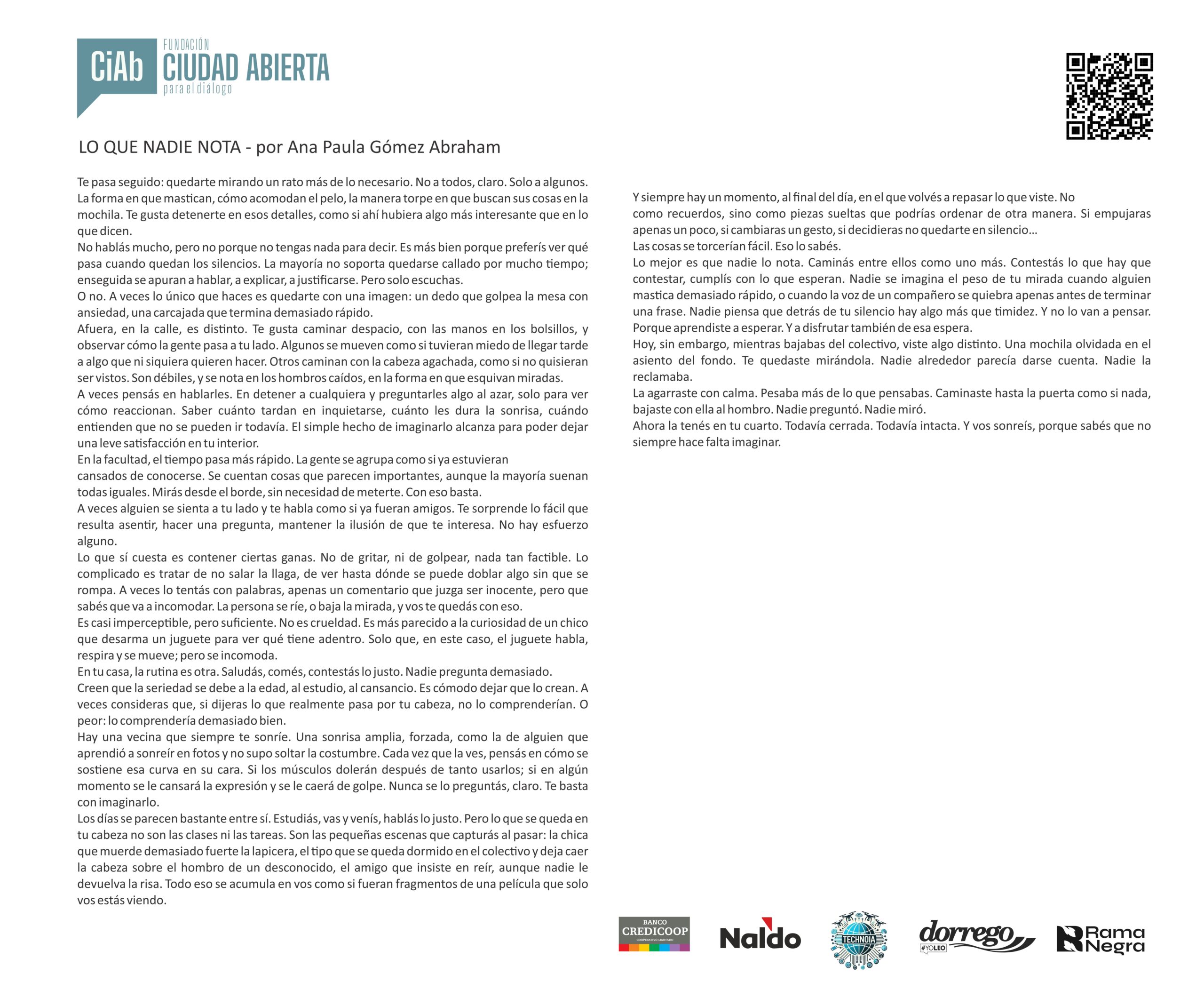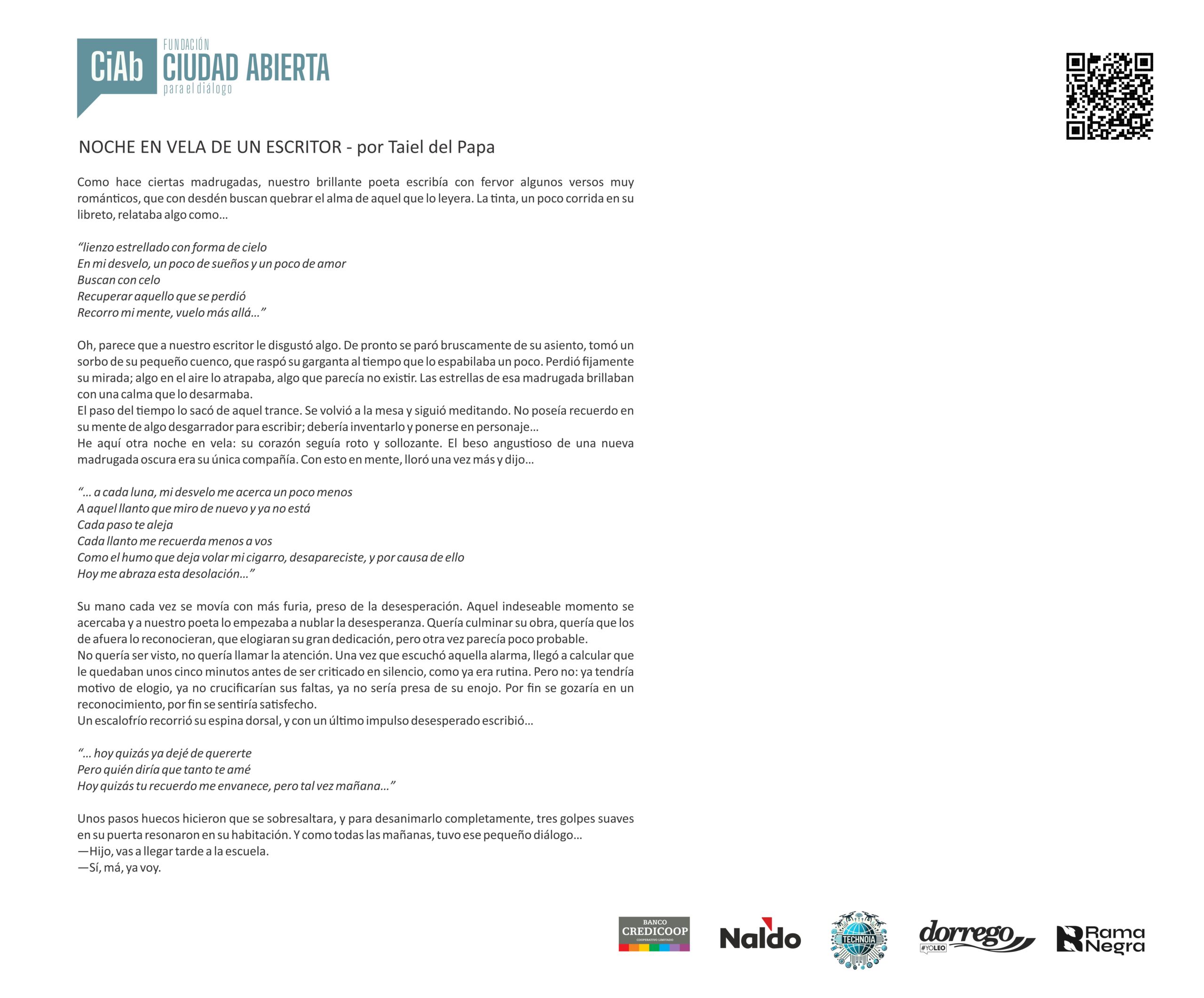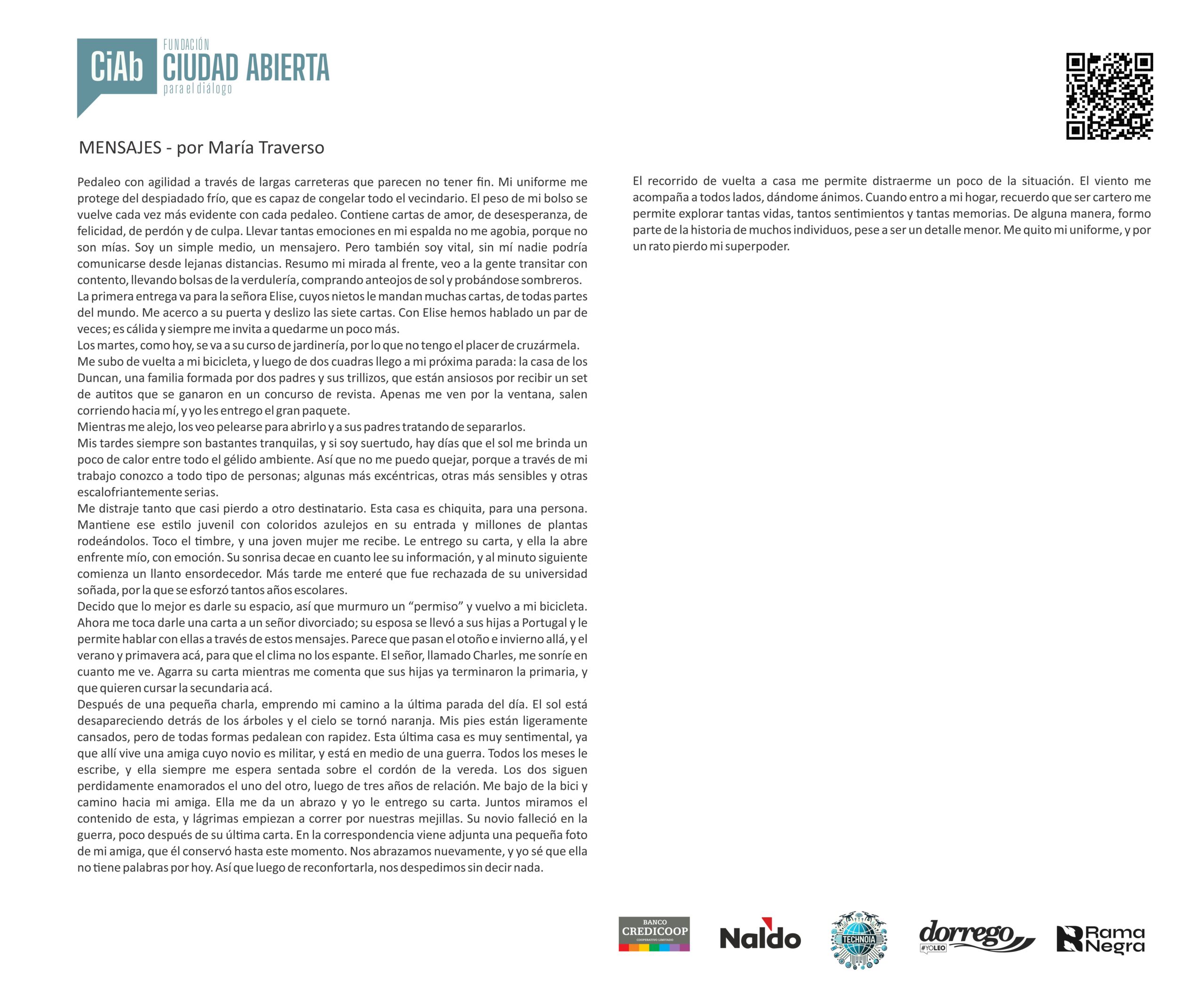 Mensaje del jurado Juan José Becerra: “Para mí fue un verdadero honor participar como jurado del concurso de la Fundación Ciudad Abierta. Puede sonar como una formalidad, como algo que uno dice porque queda bien, pero en este caso no es así: realmente lo siento. Y lo siento incluso más profundamente que en otras ocasiones en las que integré jurados, porque nunca antes me había tocado leer textos escritos por chicos tan jóvenes.